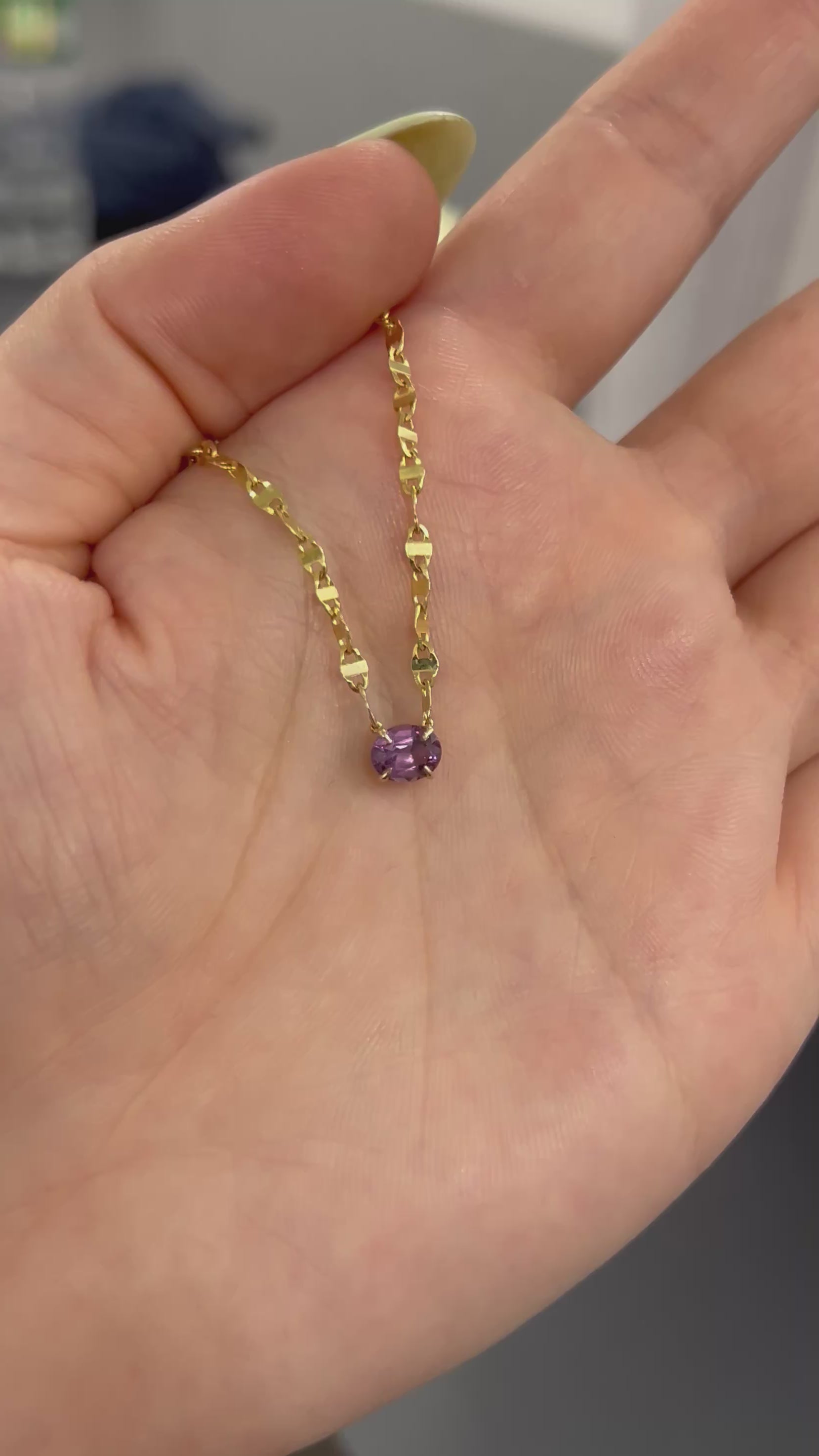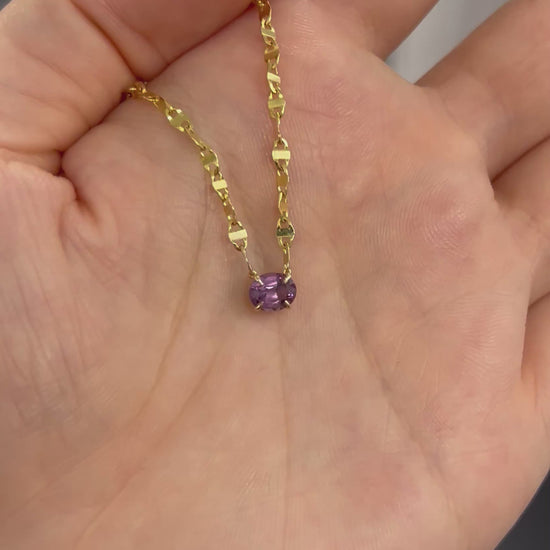 How do you make an already perfect piece even better? You add a fiery purple spinel! Our beloved, ultra sparkly, Tinsel Chain is adorned with a beautiful spinel as its centerpiece for the perfect spark of color.
