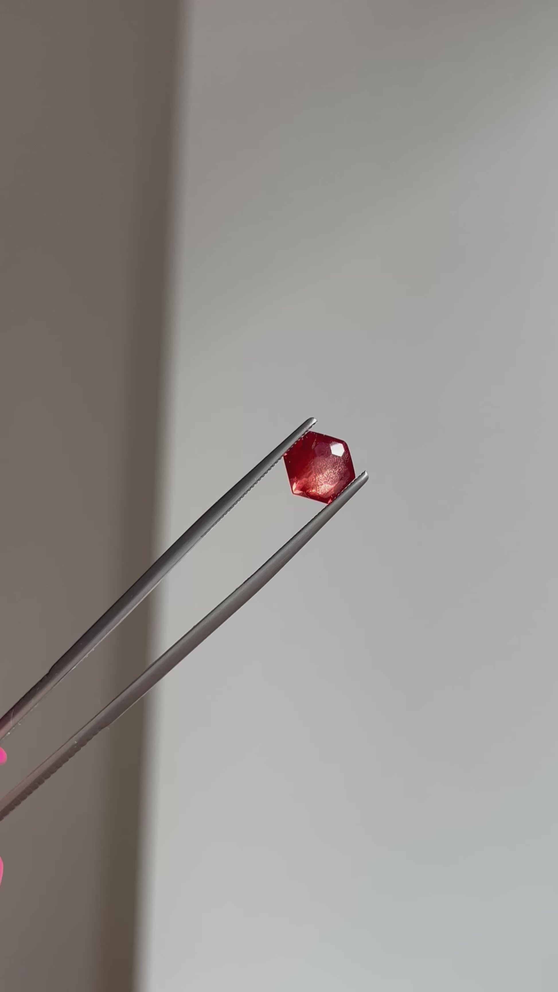 Jaw dropping scarlet Oregon Sunstone cut into a unique and proprietary Honeycomb Hexagon shape.